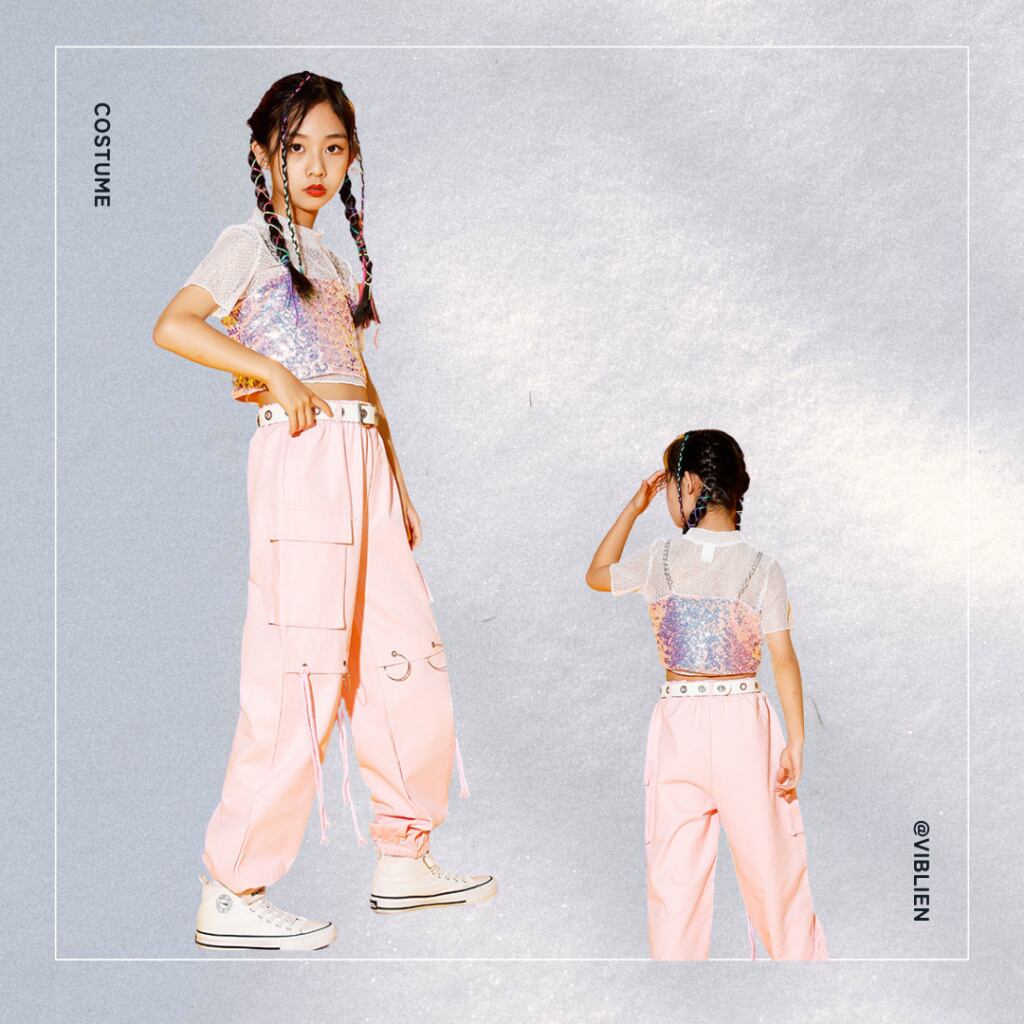 スパンコールのトップスとピンク系ボトムスで、可愛さと存在感を両立