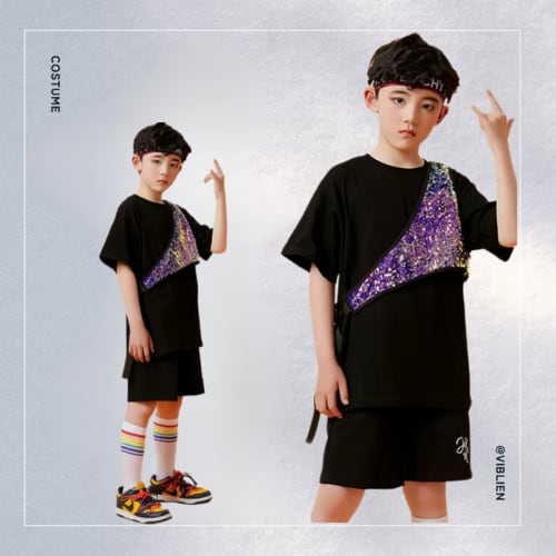 Cスタイル:黒Tシャツ×ショートパンツ+紫のキラキラバッグで、ストリート感満載