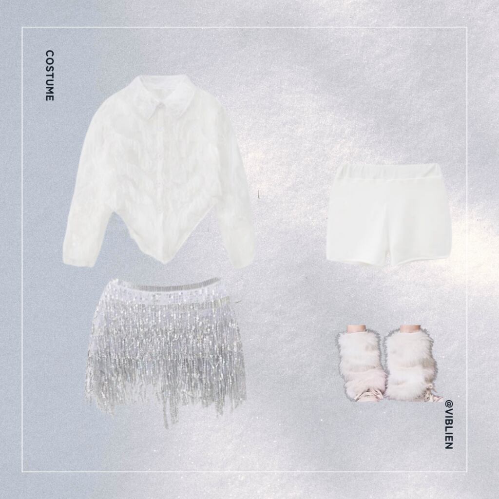 Cスタイル:シルバーフリンジスカート+ホワイトトップス+ふわふわレッグカバーで、動きのある華やかさをプラス