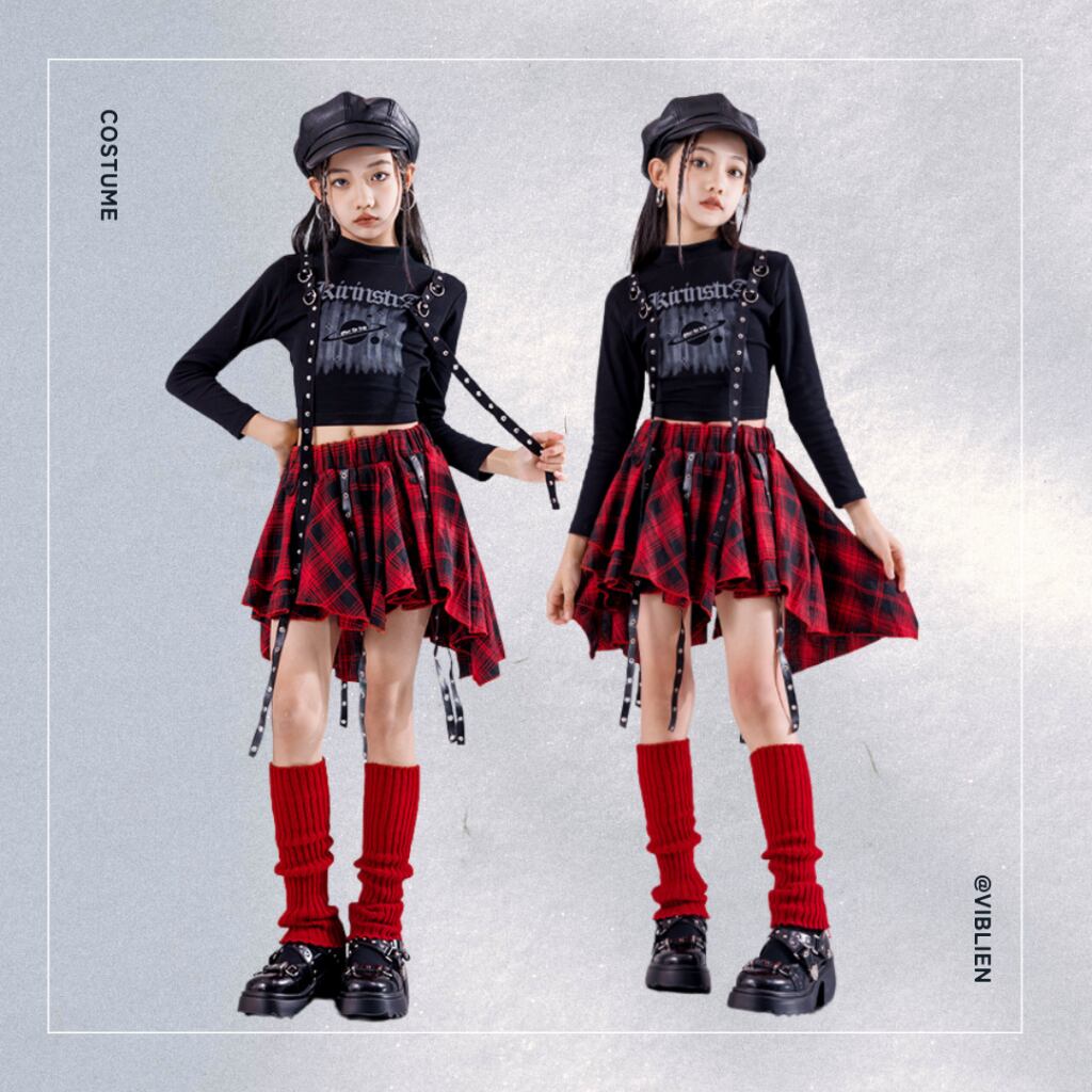 スカート×パンツ、赤×黒のコントラストで、甘さとクールさを絶妙にミックス。チェーンやベルトのディテールがアクセントになり、ステージ映え間違いなし!