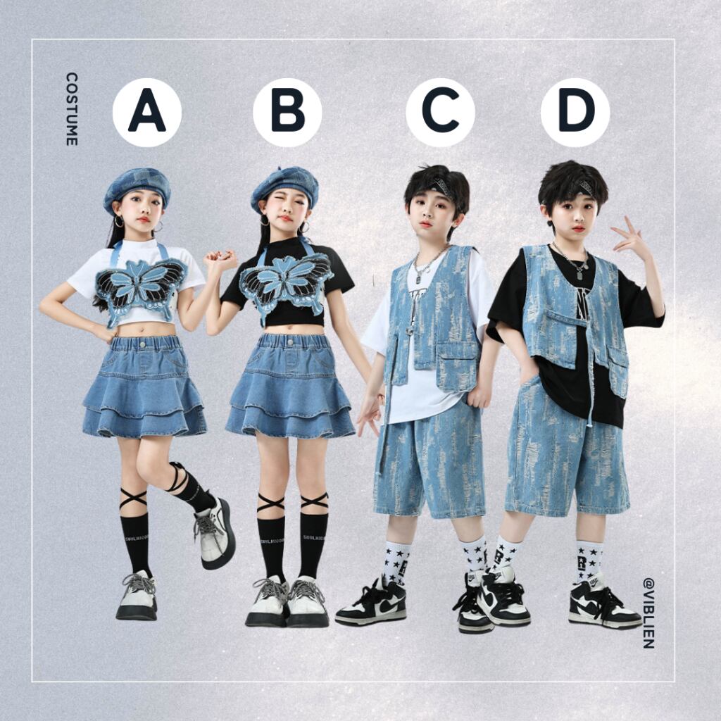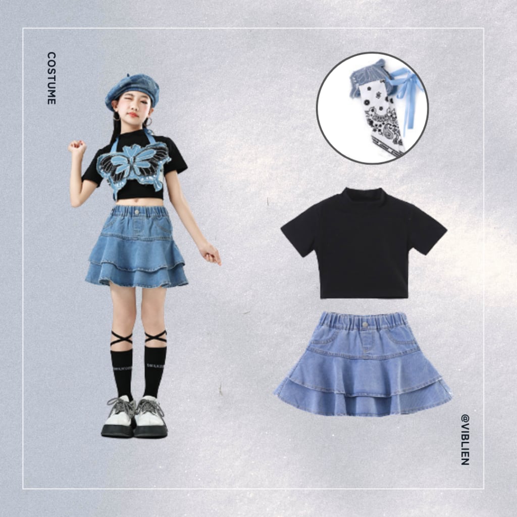 蝶のモチーフが印象的なクロップドトップスと、ふんわり広がるティアードデニムスカートがキュートなセット。