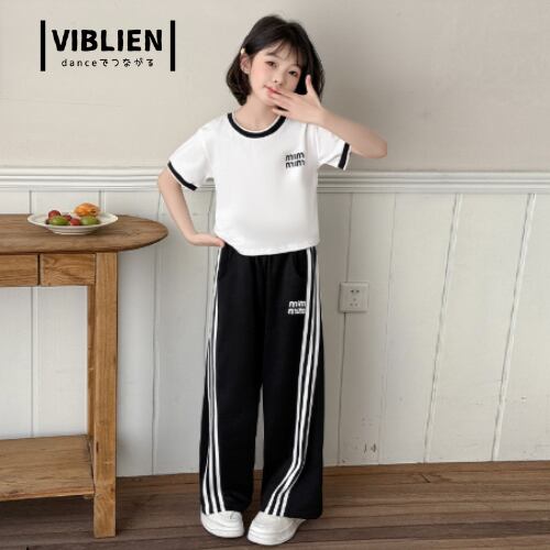 ストリート感のあるライン入りパンツと、シンプルで可愛いロゴTシャツの組み合わせ。