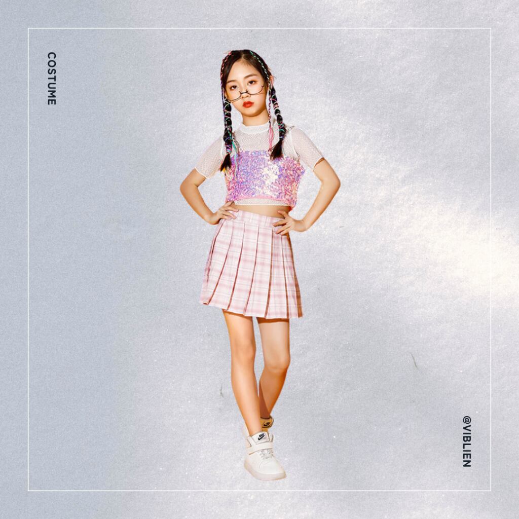 スパンコールのトップスとピンク系ボトムスで、可愛さと存在感を両立