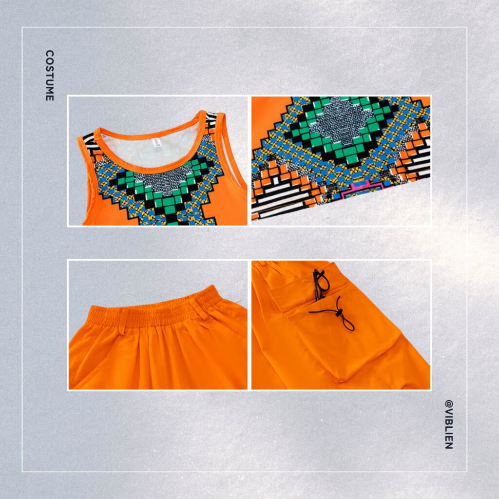 ・ボトムス:鮮やかなオレンジのバギーパンツは、ゆったりシルエット&サイドポケット付きで機能性も抜群