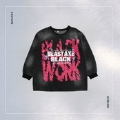 ・トップス:黒シャツにロゴがアクセント。シンプルながらも存在感抜群