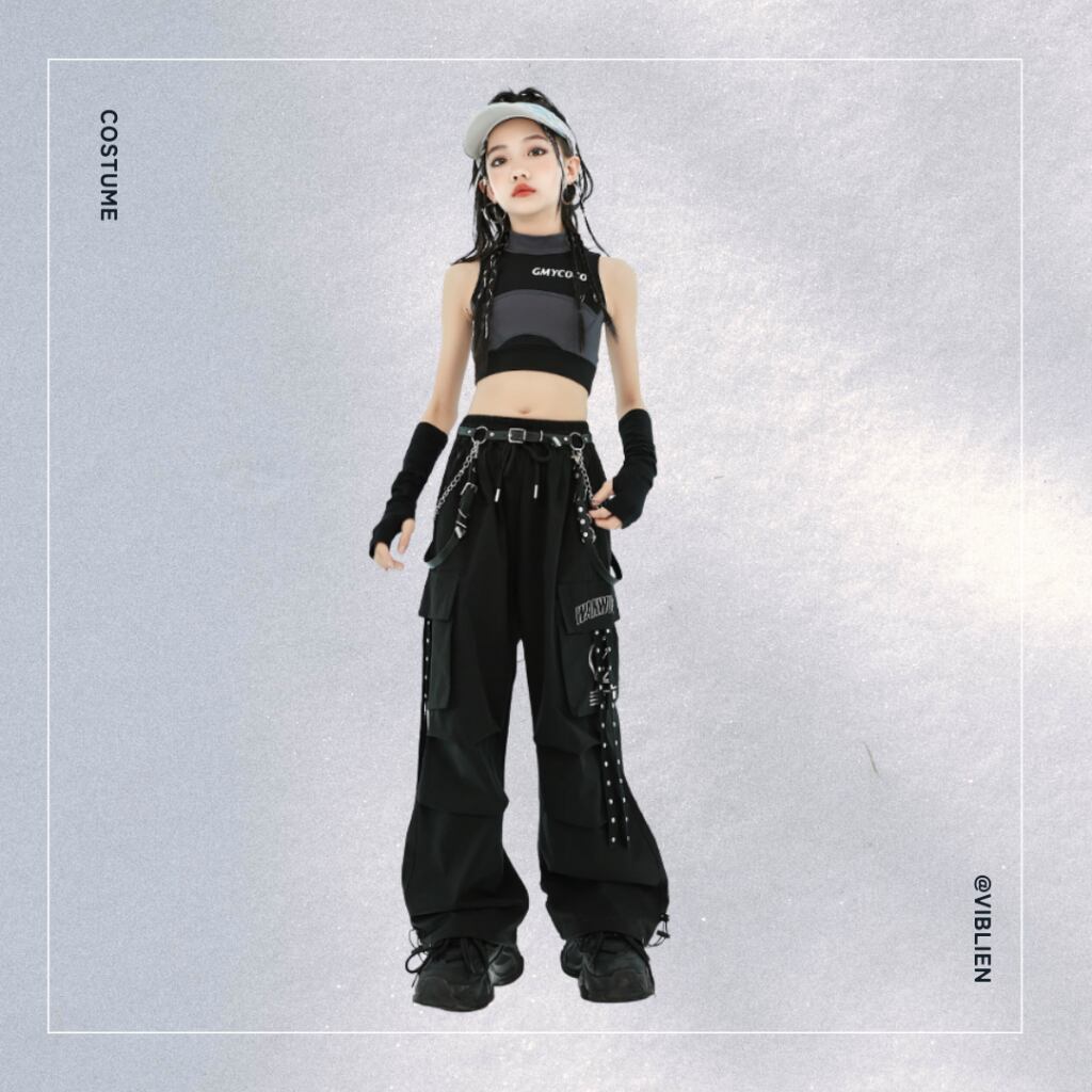 ・トップス:ロゴ入りブラッククロップトップで、シンプルながらインパクト抜群!