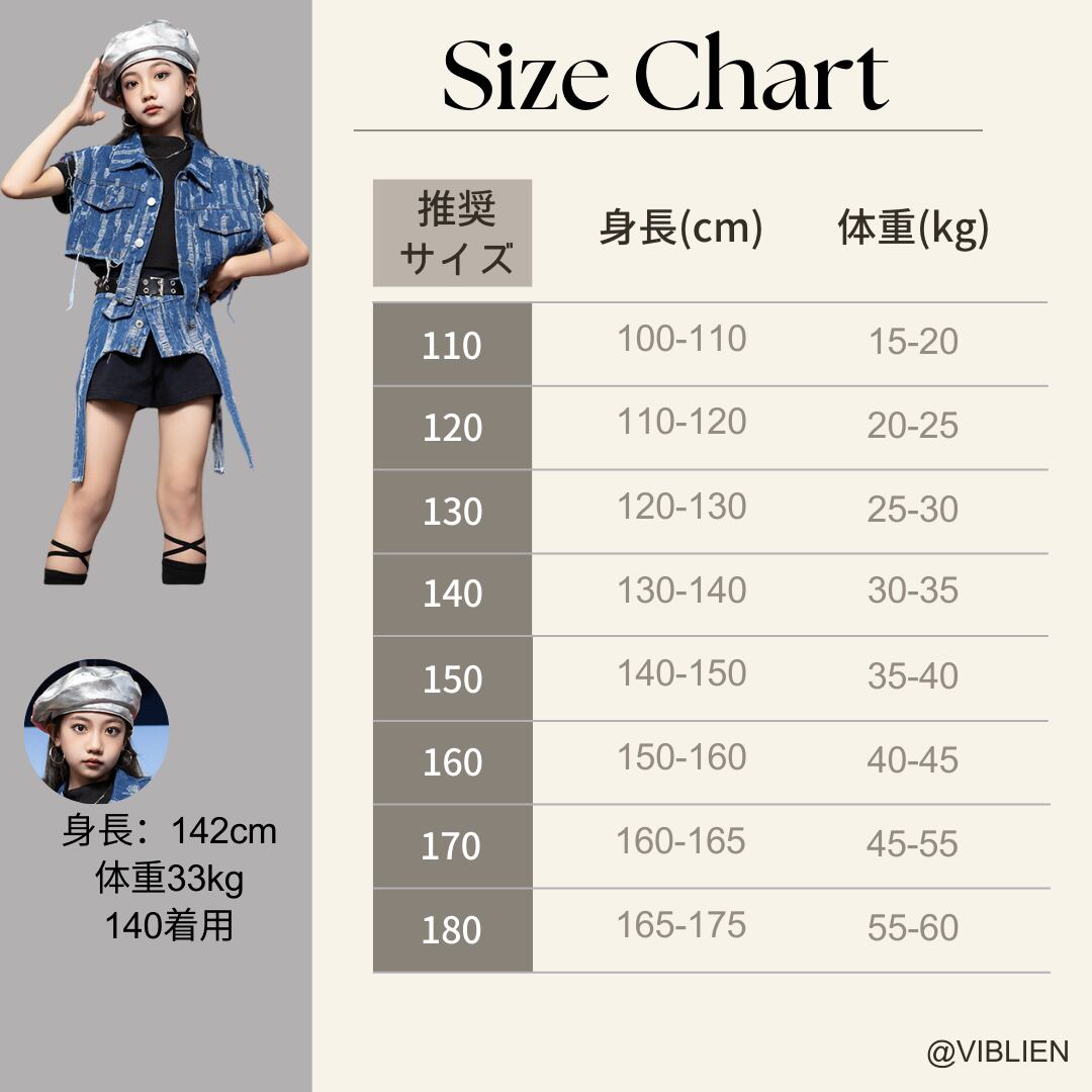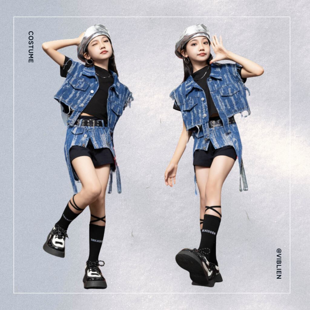 ビンテージ風デニムベストとショートパンツがセットになった、存在感抜群のキッズダンス衣装