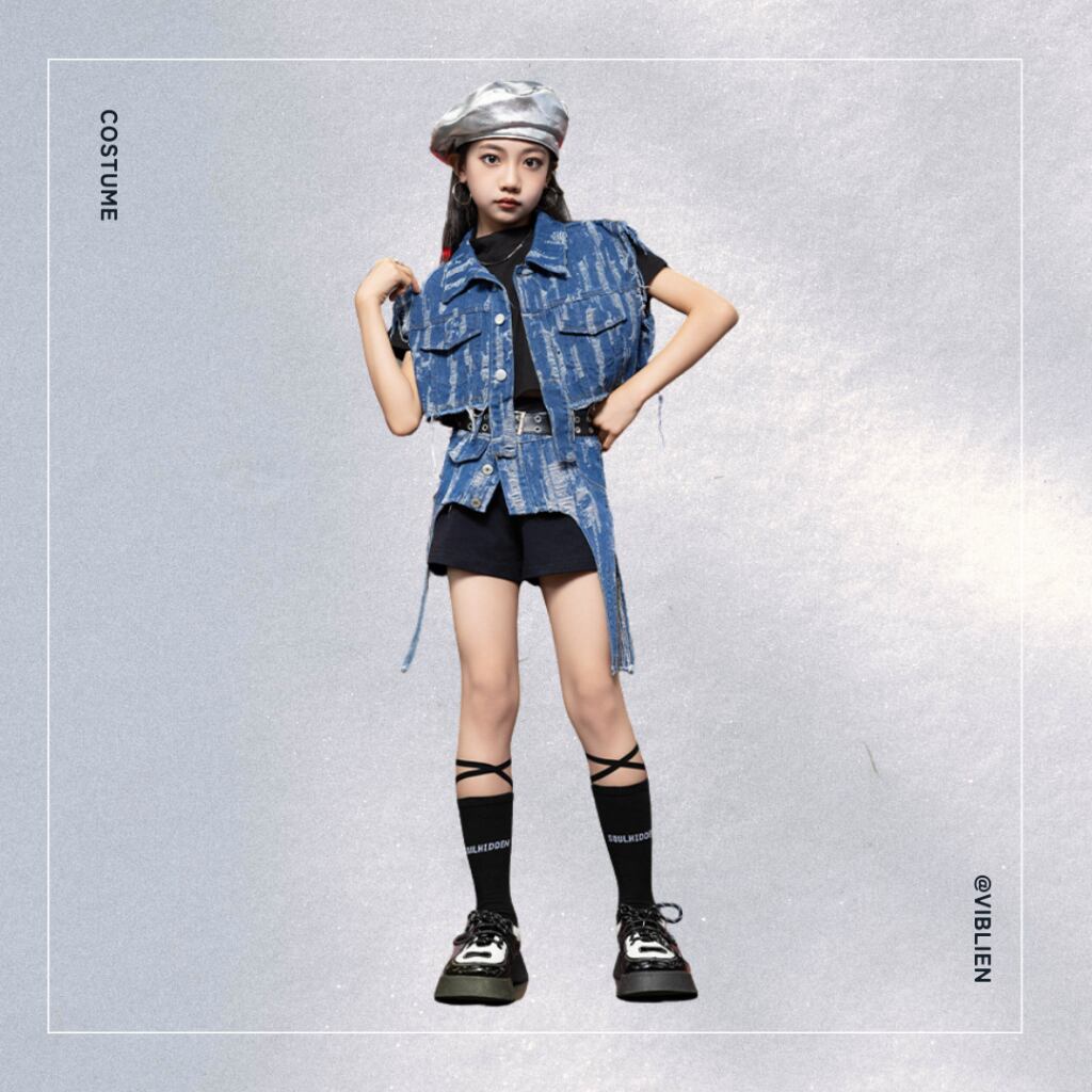 ビンテージ風デニムベストとショートパンツがセットになった、存在感抜群のキッズダンス衣装