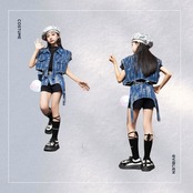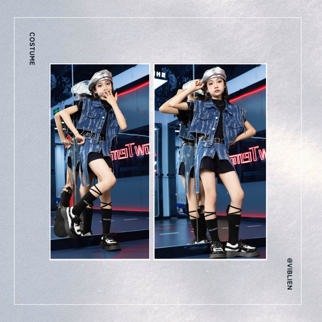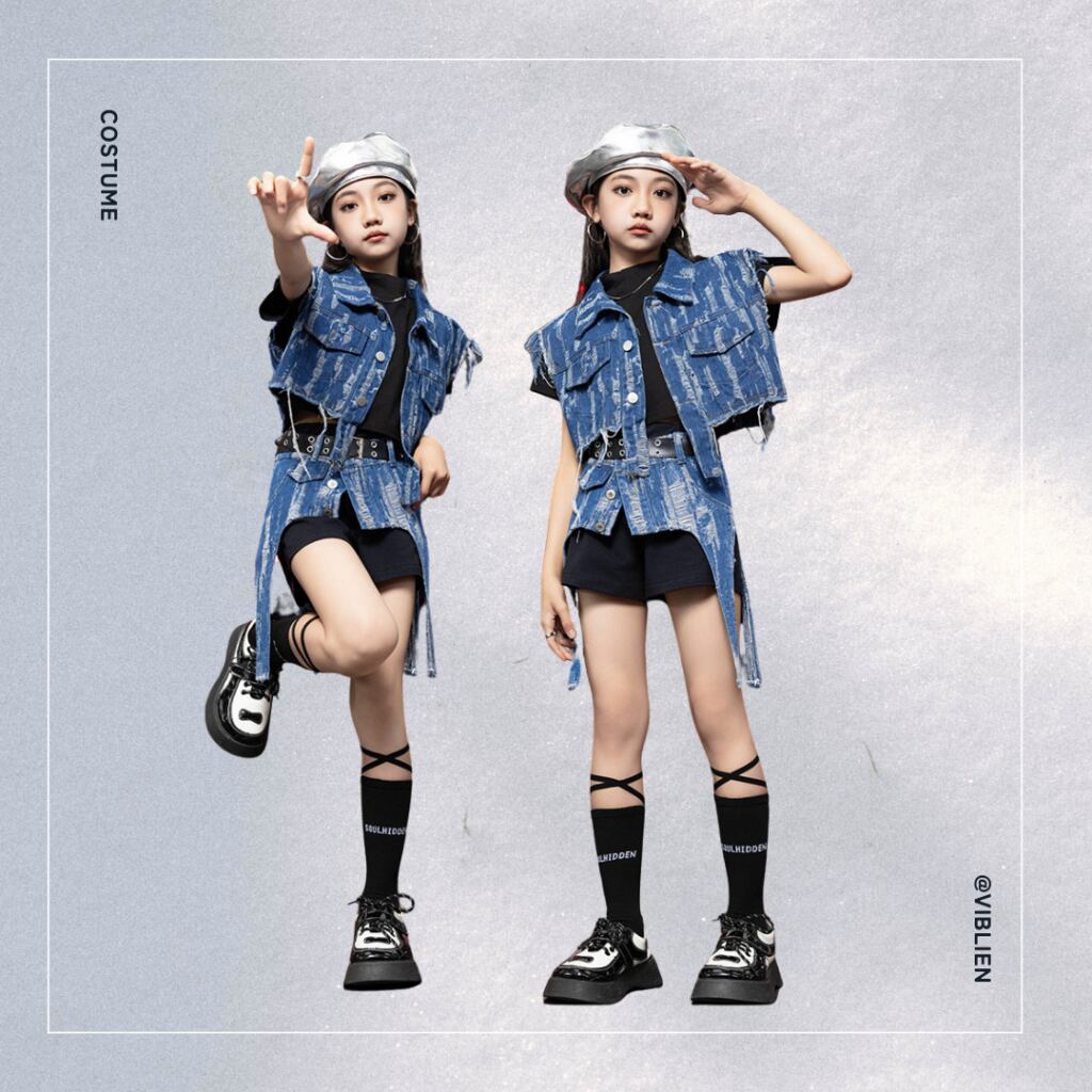 ビンテージ風デニムベストとショートパンツがセットになった、存在感抜群のキッズダンス衣装