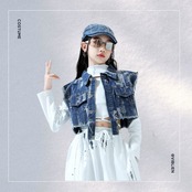 ショート丈のクラッシュ風デニムベストがコーデにアクセントをプラス