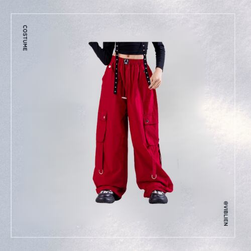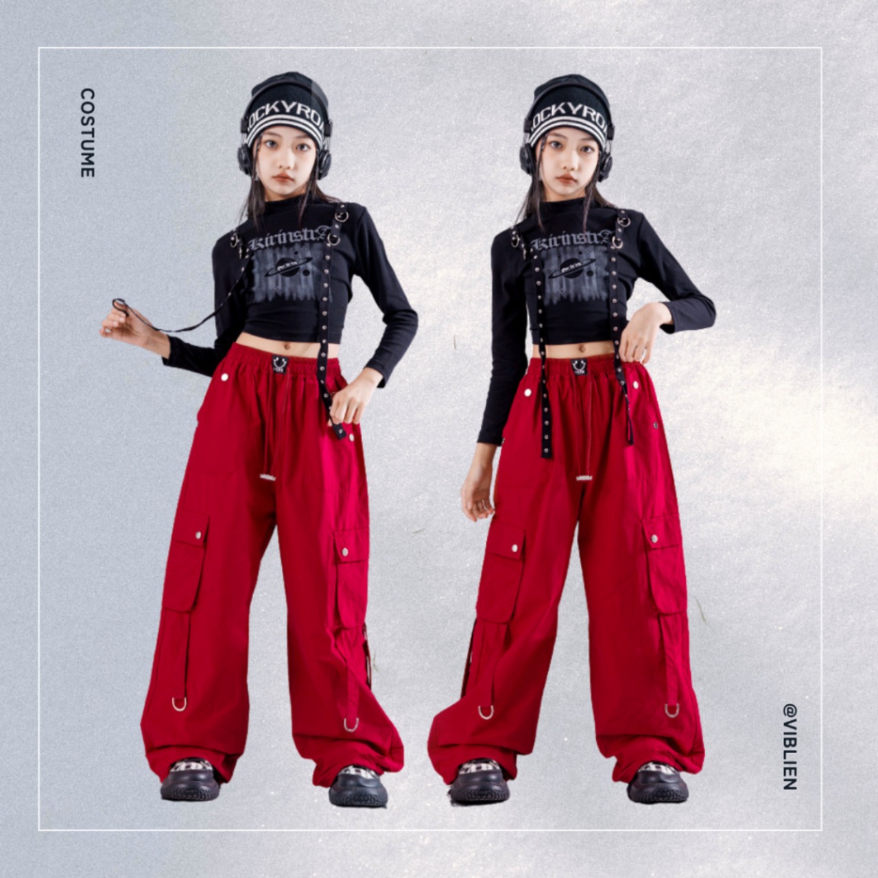 スカート×パンツ、赤×黒のコントラストで、甘さとクールさを絶妙にミックス。チェーンやベルトのディテールがアクセントになり、ステージ映え間違いなし!
